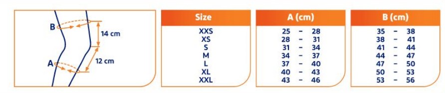 Knästödet finns i fyra storlekar. För att välja rätt storlek, mät omkretsen på låret 14 cm ovanför mitten av knäskålen, och mät omkretsen på underbenet 12 cm under mitten av knäskålen. Välj sedan storlek utifrån dina mått: