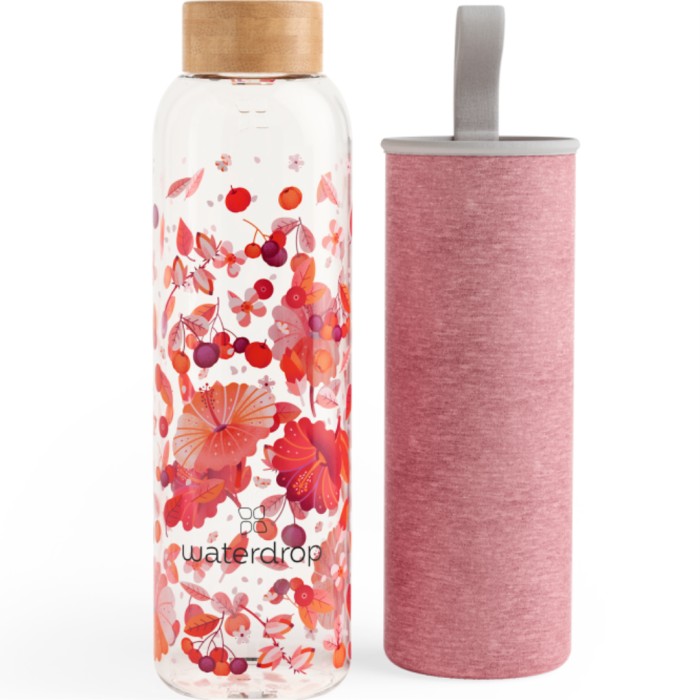 Waterdrop Glas Bottle Relax är en vattenflaska i glas som rymmer 600 ml. Flaskan är tillverkad av robust borosilikatglas och har ett lock av bambu. Den är 24 cm hög och 7,7 cm i diameter och väger 285 g. Vattenflaskan i glas är både värmebeständig och reptålig, och designad i en innovativ Soft Square-form som ger ett bekvämt grepp.