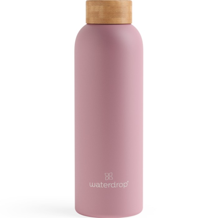 Waterdrop Bottle Steel rosa är en vattenflaska av stål som rymmer 600 ml. Denna flaska är tillverkad av robust dubbelväggigt rostfritt stål, som ger en effektiv vakuumisolering och håller ditt dryck kall i upp till 24 timmar, eller varm i upp till 12 timmar. Flaskan som rymmer 600 ml är 23 cm hög och 7,5 cm i diameter och väger 305 gram. Flaskan har ett lock tillverkat av bambu.