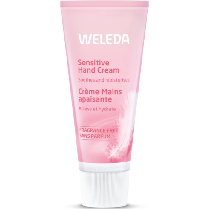 Weleda Sensitive Hand Cream är en parfymfri handkräm som mjukgör huden och gör händerna lena. Handkrämen går snabbt in i huden och innehåller ekologisk kokosolja och jojobaolja. Krämen är framtagen för att hjälpa till att lugna känslig hud. Weleda Sensitive handkräm återfuktar intensivt och reducerar känslan av torrhet.