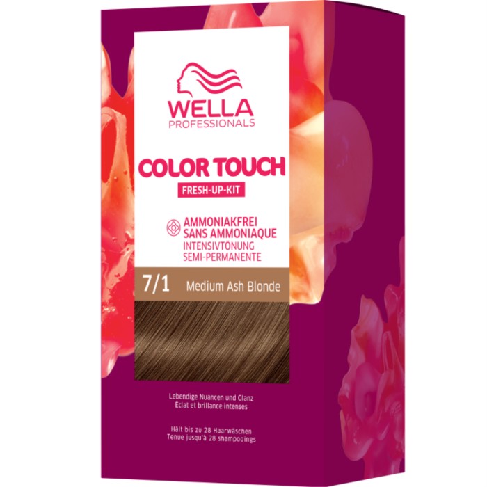 Color Touch Rich Natural Medium Ash Blonde 7/1 är en intensivtoning som ger håret fin glans med ett naturligt färgresultat. Det här professionella hårfärgnings- och hårvårdssetet kan man enkelt applicera hemma, med ett resultat på endast 20 minuter. Använd Color Touch för att bättra på vid rötterna och tona ut grått hår med upp till 50% täckning, 63% mer glans och upp till 57% mer mångfacetterad färg jämfört med obehandlat hår. Denna skonsamma formulering är fri från ammoniak och silikoner och är berikad med Light²Color Complex som skapar en intensiv livfullhet och lyster som håller i upp till 28 tvättar. Avsluta med Wella Professionals Color Brilliance Shampoo och Color Brilliance Conditioner för bästa resultat.