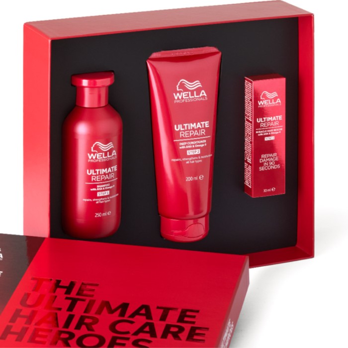 Ultimate Repair Gift Set från Wella Professionals innehåller tre hårvårdsprodukter (schampo, balsam och Miracle Hair Rescue) som hjälper till att reparera hårskador. Ultimate Repair-produkterna är formulerade med Metal Purifier-teknik, Alpha Hydroxy Acid (AHA) och omega-9. Metal Purifier-teknologin hjälper till att minska orenheter som kan skada håret, vilket initierar reparationsprocessen och en detox av håret. Kombinationen av AHA och omega-9 hjälper till att stärka och återuppbygga håret inifrån och ut. AHA bidrar till ett starkare hår, då den tränger in i hårstråna för att reparera vätebindningarna i hårfibern. Omega-9 ger näring till hårfiberns utsida och återställer hårets skyddsbarriär. Passar för alla hårtyper och texturer. Dermatologiskt testad. Vegan.