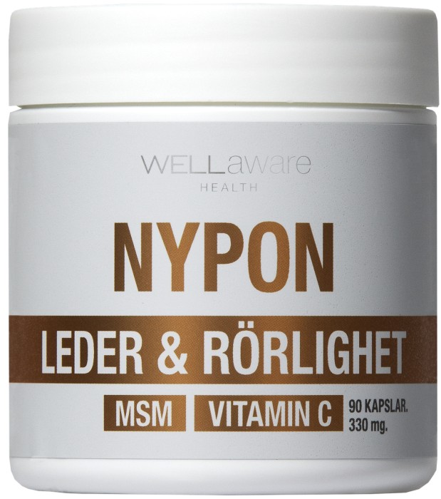 WellAware Nypon är kapslar med ett högkoncentrerat nyponpulver, C-vitamin, svartpepparextrakt (piperin) och MSM.