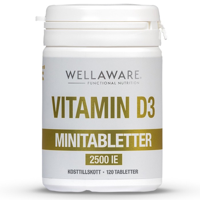 WellAware Vitamin D 2500IE är ett kosttillskott i form av minitabletter. Tabletterna är små och lätta att svälja. Innehåller sötningsmedel.