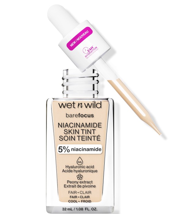 Bare Focus Niacinamide Skin Tint från Wet n Wild är en serumfoundation som ger en fjäderlätt medium täckning, som ger huden ett hälsosamt glow. Denna lätta foundation är berikad med niacinamid, en ingrediens känd för sin lystergivande effekt. Denna byggbara foundation smälter in i huden och fungerar bra under alla typer av smink. Innehåller vårdande ingredienser som niacinamid, hyaluronsyra, pionextrakt och vitamin E. Vegansk.