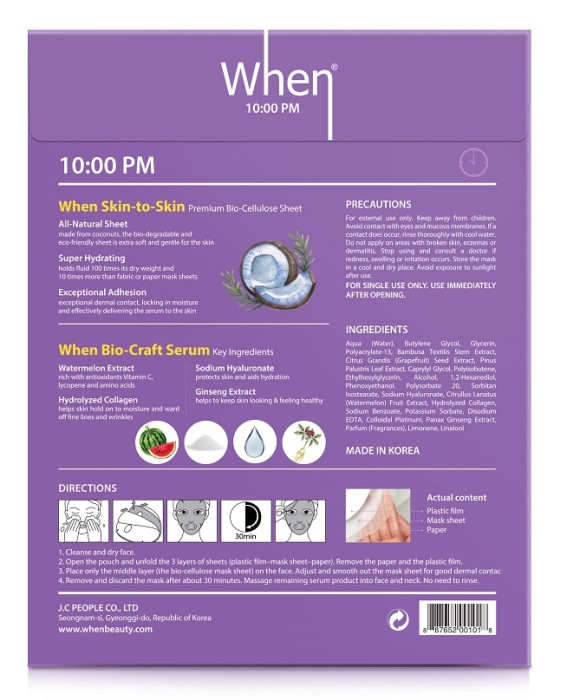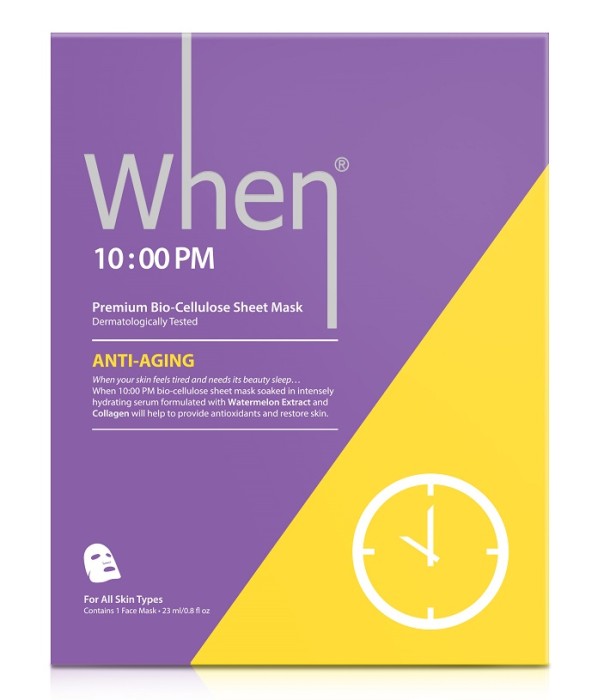 When 10:00 PM Anti-Aging Sheet Mask är en ansiktmask för hud som känns trött. Förpackningen innehåller 1 st sheet mask som är indränkt med 23 ml serum. Serumet i When 10:00 PM ansiktsmask innehåller extrakt av vattenmelon och kollagen. Liksom övriga When-produkter i denna serie innehåller denna mask även hyaluronsyra och ginsengextrakt. Arket är gjort av kokosnöt.