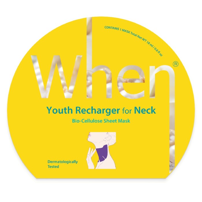 When Youth Recharger for Neck är en sheet mask för huden på halsen. When Neck Mask innehåller pärlextrakt, kollodial platinum och enzymatisk kollagen. En mask framtagen för att hjälpa huden att få lite ny energi, att öka elasticiteten och ge huden lyster.