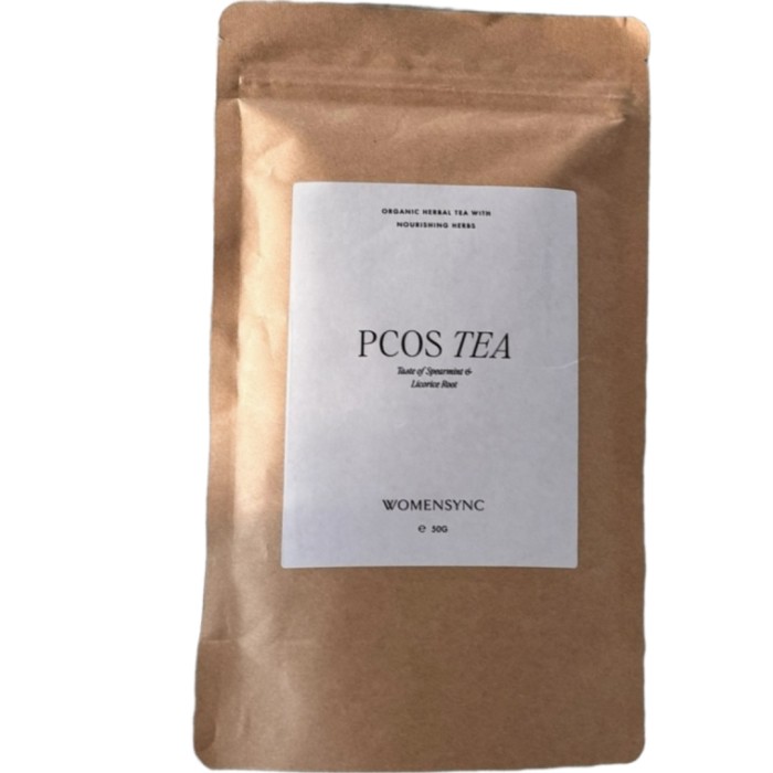 Womensync PCOS Tea är en ekologisk, koffeinfri örtblandning som innehåller en sammansättning av brännässla, grönmynta, citronmeliss, lakritsrot, maskrosrot och kanelbark. Detta är en örtblend utformad av Womensyncs örtspecialist Erla Sól. Teet har en smak av grönmynta, kanel och lakrits.