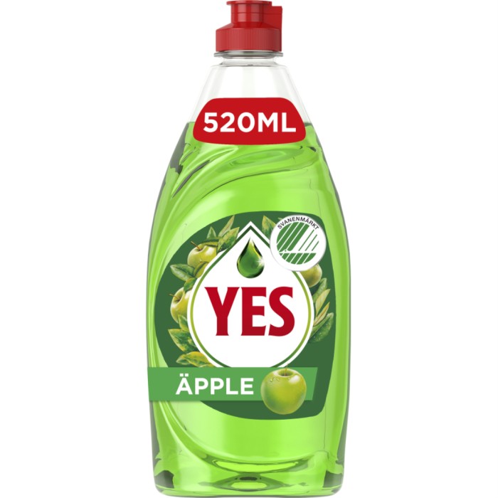 YES handdiskmedel ger en skinande ren disk och fyller ditt kök med en lätt, fräsch doft. YES Äpple har en rik formulering för att effektivt avlägsna ingrodda matrester, och har en fruktig doft av äpple. Svanenmärkt.