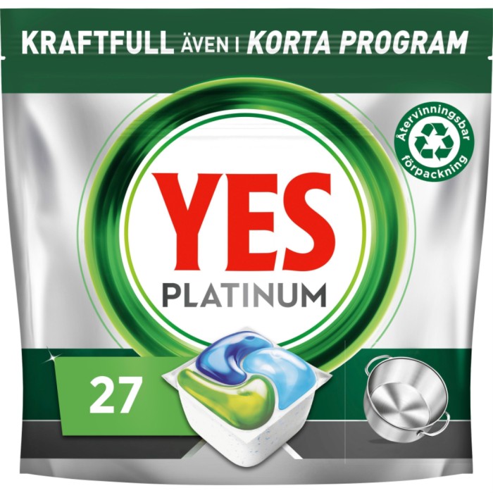 Yes Platinum All in One diskmaskinstabletter klarar även de tuffaste rengöringsutmaningarna för att få din disk skinande ren. Yes Platinum tar t.o.m. hand om flottiga filter för att ge en ren disk och en fräsch diskmaskin. Yes kombinerar vätska och pulver i en kraftfull kapsel. Det ytterst lättlösliga höljet löses upp fort så att kapseln kan börja rengöra och utföra sitt jobb. Och de är enkla att använda - ingen uppackning behövs, lägg dem bara i diskmaskinens diskmedelsbehållare. Hjälper till att förhindra fettansamlingar i diskmaskinen. Har inbyggd salt- och spolglansfunktion, inklusive glas- och silverskydd.