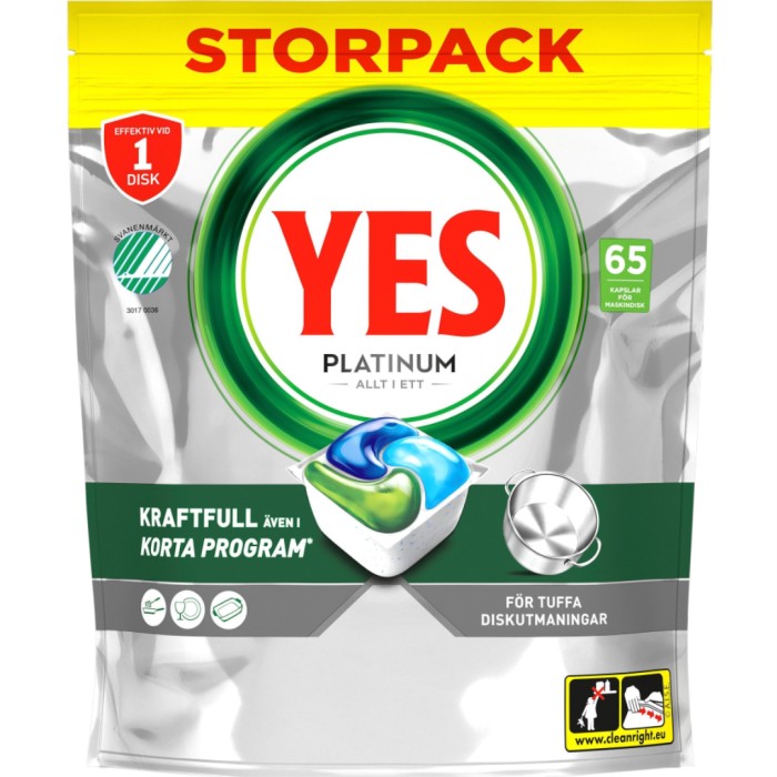 Yes Platinum All in One diskmaskinstabletter klarar även tuffa rengöringsutmaningar för att ge en skinande ren disk. Yes Platinum tar till och med hand om ditt flottiga filter för ren disk och en fräsch diskmaskin. Yes kombinerar vätska och pulver i en kraftfull kapsel. Det ytterst lättlösliga höljet löses upp fort så att kapseln kan börja rengöra och utföra sitt jobb. De är så enkla att använda - ingen uppackning behövs, lägg dem bara i diskmaskinens diskmedelsbehållare.