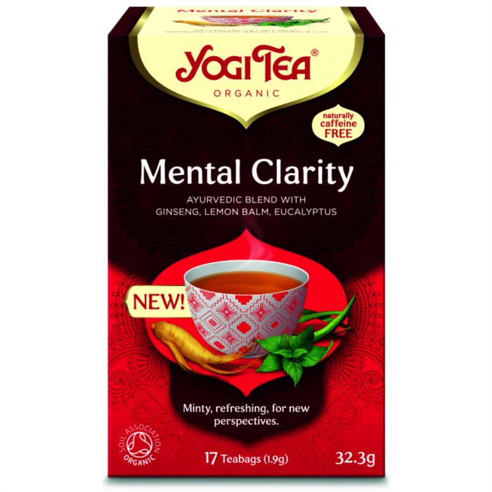 Yogi Tea Mental Clarity är ett friskt och kryddigt örtte med bland annat ginseng, citromeliss och eukalyptus. Teet Mental Clarity innehåller även pepparmynta, citrongräs, grönmynta, lakritsrot, rooibos, ingefära, kanel, maca, svartpeppar, apelsinolja, kardemumma och pepparmyntsolja.