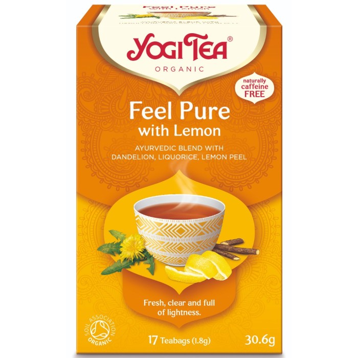 YogiTea Feel Pure Lemon är ett naturligt koffeinfritt te med en ayurvedisk komposition med fruktig citron, lätt besk maskros och ingefära, avrundad med lakritsrot.
