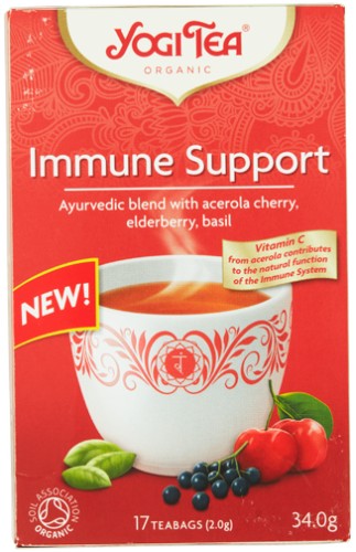 YogiTea Immune Support är ett ayurvediskt te med örter, frukter och kryddor. Immune Support innehåller bland annat nypon, acerola, basilika, kanel, ingefära, kardemumma och fläderbär. Ett te som tar naturen hem till din tekopp.