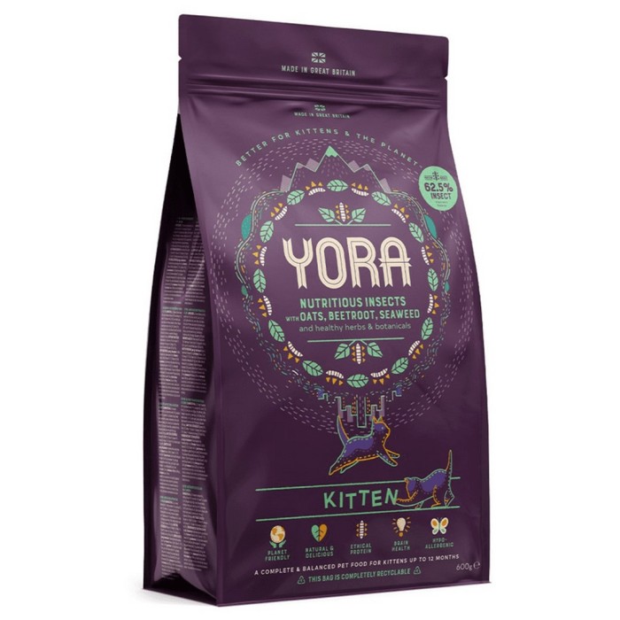 Yora Kitten foder för kattungar innehåller 62,5 % protein från insekter, en unik proteinkälla som är full med nyttiga näringsämnen och kan samtidigt hantera foderallergier. Fodret innehåller fetter, probiotika, kalcium, antioxidanter och en sammansättning som hjälper till att hålla kattingens hjärna, hud, päls, leder och mage i god form.