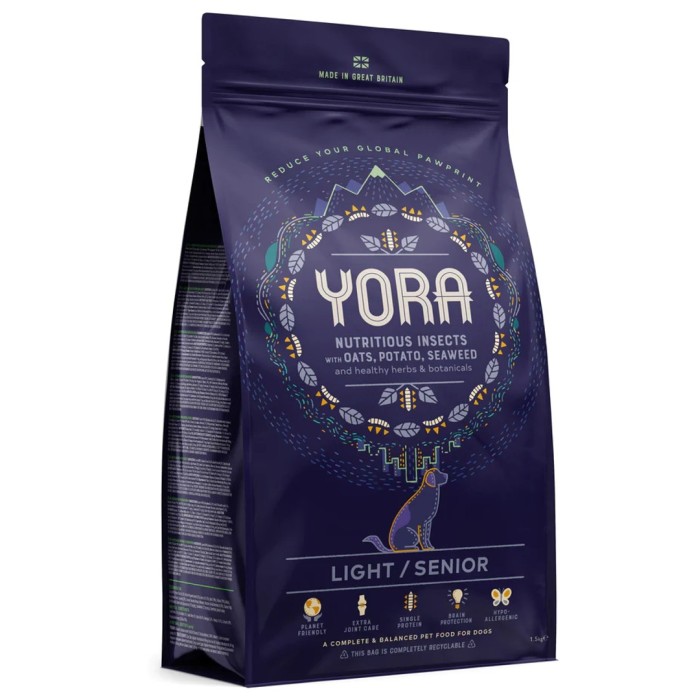 YORA Dog Senior/Light är ett komplett och balanserat foder till äldre hundar av alla storlekar och för viktkontroll. Detta är ett insektsbaserat foder med fibrer som både mättar och är näringsrikt. YORA har tagit fram en krispig och välsmakande foderkula med en smak som hundar tycker om.