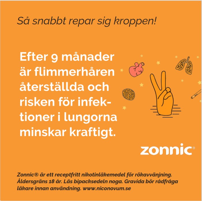 Fukta påsen lätt med tungan och lägg in den under läppen. Flytta gärna runt den då och då för ökad effekt. Du kan ha påsen under läppen i ungefär en halvtimme. I början av behandlingen kan 1 portionspåse tas varje till varannan timme. I de flesta fall är 8-12 portionspåsar per dag tillräckligt. Högst 24 portionspåsar per dag bör användas. Rökavvänjning Behandlingstiden är individuell, men pågår vanligtvis i minst 3 månader. Därefter minskas gradvis antalet portionspåsar per dag. Behandlingen bör avslutas när dosen minskats till 1-2 portionspåsar per dag. Du kan dock ta en portionspåse vid tillfällen när du är frestad att röka. Använd inte Zonnic Mint i mer än 6 månader utan att rådgöra med din läkare eller med apoteket. Rökreduktion Zonnic Mint används mellan rökperioder för att förlänga rökfria intervaller och med syftet att minska rökningen så mycket som möjligt. Om du efter 6 veckor inte kunnat minska antalet cigaretter per dag bör du söka professionell hjälp. Du bör försöka att sluta röka så snart du känner dig beredd, dock inte senare än 6 månader efter du börjat använda Zonnic Mint. Om du inte lyckats göra ett allvarligt försök att sluta röka inom 9 månader bör du söka professionell hjälp. Använd inte Zonnic Mint i mer än 6 månader utan att rådgöra med din läkare eller med apoteket. Nikotineffekterna inträder först efter några minuter. Därför kan man inte vänta sig samma snabba tillfredsställelse som vid rökning. Faran för förgiftning är liten om man skulle råka svälja ned munhålepulvret eftersom nikotinet då löses ut långsamt och ofullständigt. Personer under 18 år skall endast använda Zonnic Mint efter läkares ordination. Zonnic Mint ska inte användas av icke-rökare. En normal dos för vuxna kan allvarligt förgifta eller till och med döda ett litet barn. Det är därför viktigt att du alltid förvarar Zonnic Mint utom syn- och räckhåll för barn.