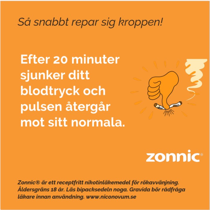 Rekommenderad dos är 1-2 sprayningar vid varje tillfälle. I början av behandlingen kan munhålesprayen tas varje till varannan timme. Vanlig dos är 1-2 sprayningar 8-12 gånger per dag. Högst 30 spraydoser per dag bör användas (t.ex. 2 sprayningar, 15 gånger per dag). Bruksanvisning Spraya 1-2 gånger mellan kinden och tänderna: 1. Vrid spraypipen till sidan 2. Rikta spraypipen mellan kinden och tänderna 3. Spraya 1-2 gånger, skifta mellan vänster och höger kind Rökavvänjning Behandlingstiden är individuell, men pågår vanligtvis i minst 3 månader. Därefter minskas gradvis nikotindosen. Behandlingen bör avslutas när dosen minskats till 1-2 spraydoser per dag. Du kan dock ta en spraydos vid tillfällen när du är frestad att röka. Använd inte Zonnic Pepparmint i mer än 6 månader utan att rådgöra med din läkare eller med apotekspersonal. Rökreduktion Zonnic Pepparmint används mellan rökperioder för att förlänga rökfria intervaller och med syftet att minska rökningen så mycket som möjligt. Om du efter 6 veckor inte kunnat minska antalet cigaretter per dag bör du söka professionell hjälp. Du bör försöka att sluta röka så snart du känner dig beredd, dock inte senare än 6 månader efter du börjat använda Zonnic Pepparmint. Om du inte lyckats göra ett allvarligt försök att sluta röka inom 9 månader bör du söka professionell hjälp. Använd inte Zonnic Pepparmint i mer än 6 månader utan att rådgöra med din läkare eller med apotekspersonal. Nikotineffekterna inträder först efter några minuter. Därför kan man inte vänta sig samma snabba tillfredsställelse som vid rökning. Personer under 18 år skall endast använda Zonnic Pepparmint efter läkares ordination. Zonnic Pepparmint ska inte användas av icke-rökare. En normal dos för vuxna kan allvarligt förgifta eller till och med döda ett litet barn. Det är därför viktigt att du alltid förvarar Zonnic Pepparmint utom syn- och räckhåll för barn.